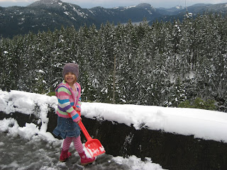 This past weekend Victoria and a greater portion of the Northwest got a lovely surprise of late-spring snow. Personally, I am soooo ready for some warmer weather, but apparently it is not yet to be. The kids and I built a couple of small snowmen with measuring cups for hats and the traditional carrot nose. Then we all went for a drive to higher elevation so the kids could play in the snow. We drove up a road called The Malahat to neat scenic overlook. The kids had a great time, mostly throwing snowballs at Dad. Surely summer is on the way.